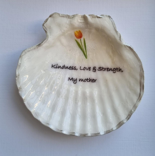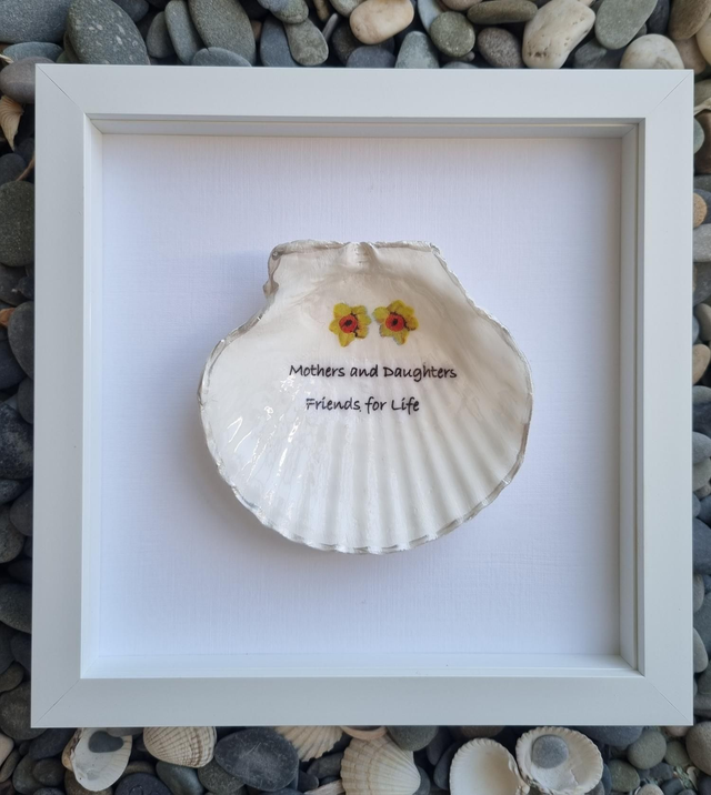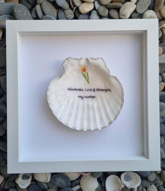 Each natural scallop shell is delicately finished and presented in a white 9 inch box frame, creating a timeless piece of wall art or shelf décor. Every shell features a carefully applied quotes for mothers, paired with a subtle decorative detail such as florals, butterflies, or bows. It is hand painted and a gilt edge has also been applied. No two shells are exactly alike, making each frame a truly unique keepsake.