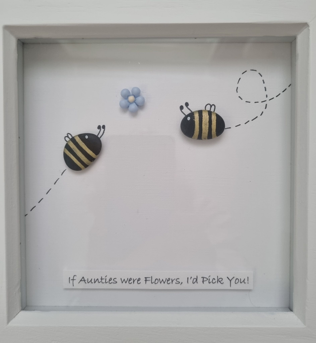 Introducing this beautiful, pebble art picture frame for an Aunt with the message 'If Aunties were Flowers, I'd Pick You!'. Handcrafted with attention to detail, these frames come in a 7 or 9 inch frame options. The intricate design features hand-painted bees in gold and black with a dainty pale blue flower. The combination of natural pebbles and carefully crafted art make these frames a one-of-a-kind piece, perfect for gifts.